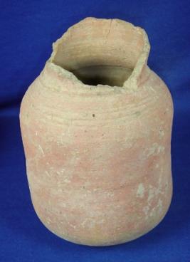 | Description / विवरण | Semi fine terracotta jar with slightly flat and circular base, cylindrical body that is slightly curved in the middle and broad neck which is partially broken. Its rim is missing and close striation mark is visible on the upper part of the body. A small hole is on the body due to breakage. |