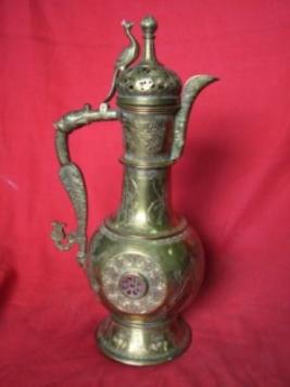 | Description / विवरण | A coffee pot decorated all over in Bokhara pattern. Some mythological figures are carved on the belly and garnets are embeded in the centre. Peacock is mounted on the lid. |