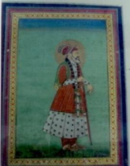 | Description / विवरण | The painting depicts Sultan Sijijuddin standing in a profile wearing a gold and orange striped and white coloured tunic Jama , with a golden halo behind holding a sword downwards in one hand and a flower downwards in another. The foreground has a narrow green strip of ground and the background is green and blue sky. The border has a golden strip with floral designs. |