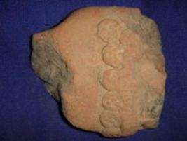 | Description / विवरण | Terracotta female figurine, the waist portion is visible. The figurine has a broad hip and wearing a drapery having some circular embossed designs. |
