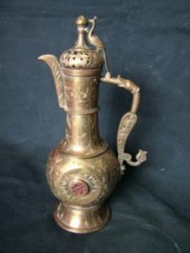 | Description / विवरण | This is a coffee pot with engraved floral pattern. It is embeded with a set of garnets. One peacock is mounted on the lid. |