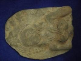 | Description / विवरण | Terracotta female figurine on low relief. The upper part from chest of the body is visible. The figurine has an elaborate headgear having some floral design in the centre and she is wearing kundalas and necklace. The face is mutilated but eyes are prominent. |