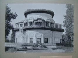 | Description / विवरण | This is a black and white photograph of a building in which beautiful grills decorated door are visible, some cripples are on the outer wall and there one male statue standing on a pedestal is shown. Besides these a tree is visible. |