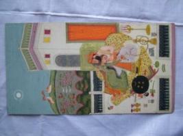 | Description / विवरण | The painting depicts a lady & a men setting in a Palke . The man is holding the hand of the lady. Another lady setting beside them is trying to uncloth the pejjama of the lady. A lady alleredent is standing behind the lalki. IN foreground there are two flowers pot, stains & paths. In background sky is visible through the window & ceiling of the palace is also visible. It has border made up of blue, golden & pace pink colour. |