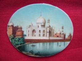 | Description / विवरण | The miniature painting depicts the Taj Mahal of Agra in white marble on the bank of the Yamuna resting on a white platform. It has a big arched door visible from all sides. The structure has one dome at the centre and cenotaphs at four corners and miniatures at four sides of the platform. There are red structure and boundary all around the white Yamuna flowing through it. The background has a blue sky. |