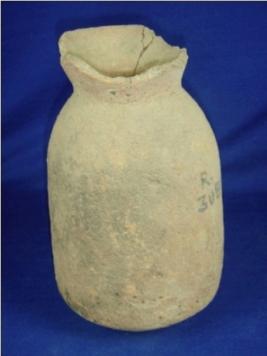 | Description / विवरण | Coarse terracotta jar with oval base, cylindrical body, narrow neck and raised outward rim, which is partially broken and cracked. |