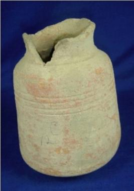 | Description / विवरण | Coarse, incrustation terracotta jar with oval base cylindrical body, broad neck which is partially broken and its rim is missing. Close striation marks are visible on the upper part of the body. Carnation mark is visible just below the neck. |