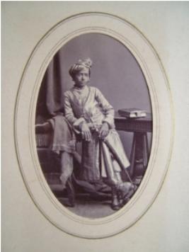 | Description / विवरण | The photo shows prince bending on the sofa cushioned chair is wearing bright coloured jama, turban and necklace and holding the sword in his hand. In the background, a book is kept on the table. |