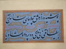 | Description / विवरण | It gives the details of the progress of poetry discussion between two poets. it is handwritten in the Persian language of Nastaliq style this text written within a floral border of multi colour. It is written in black ink on green and white ground of woollen shape. |