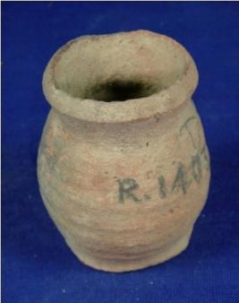 | Description / विवरण | Coarse terracotta miniature pot having a rim with concavity below, narrow neck, bulbous shape body and a flat circular base. The striation marks are seen prominently on the body. |