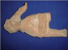| Description / विवरण | Broken terracotta female figurine whose head, right arm and left leg is missing. She is adorned with necklace, bracelet and waistband. Her naval is prominent, made by thumb impression. |