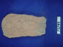 | Description / विवरण | Terracotta figurine of a female in standing position, in low relief. She has her hands bend away from the body and placed on the hips. An elaborate headgear, large circular earrings, two necklaces, girdle with tussles at both sides and anklets are visible. It is rubbed out and the feet are broken. |