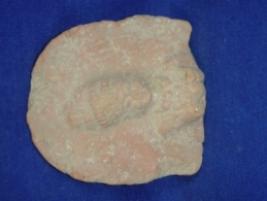 | Description / विवरण | Terracotta female figurine, probably of a Yakshi. The upper portion, up to the bust, is there, lower portion is missing. The figure is in low relief on an oval base. She is wearing an elongated multi-tiered headgear, circular earrings and two necklaces. Right arm is partly broken. |