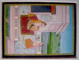 | Description / विवरण | Queen is sitting on a chair. A female attendant is sitting in front of her and holding a parrot in one hand. She is wearing yellow and golden silver coloured cloth. Beautiful palace is seen, garden in right corner upper side. |