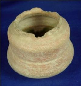 | Description / विवरण | Coarse terracotta vessel - jar with oval base, body having double lota structure of which lower body s diameter is more than upper body, have a carinated waist, but a thick and averted rim. The rim is broken from half part. |