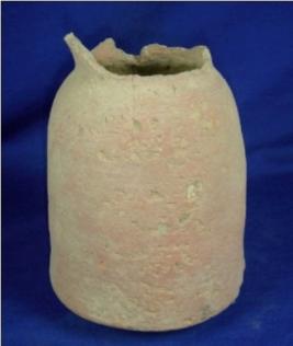 | Description / विवरण | Coarse terracotta vessel - a jar, with broad neck, cylindrical body and round base. The upper body is curved and the lower body at base is slightly flayed. The rim and neck are broken and the upper body has a small hole. |