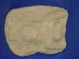 | Description / विवरण | Terracotta female figurine, probably of a Yakshi. The upper portion, up to the bust is there, the lower portion is missing. The figure is in low relief on flat base. She is wearing an elaborate headgear, having two pearl tussles hanging at right side and three kalgis at left side, large, hollowed circular earrings and three necklaces. Her right breast is partly broken. |