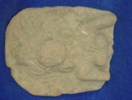 | Description / विवरण | Terracotta female figurine, probably of a Yakshi, in low relief. She is bedecked with an elaborate headgear, having two pearl strings, hanging in the right side and three feathers at the left side, large hollowed circular earrings and three stranded necklace. Only the upper portion, up to the bust, is there, the lower portion is missing. |