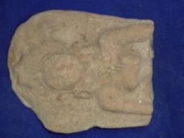 | Description / विवरण | Terracotta female figurine, probably of a yakshi, in low relief, on oval base. only the upper portion, up to the bust is there, the lower portion is missing. She is bedecked with headgear with two pearl strings, tussles hanging at right side and there feathers at the left, hollowed circular earrings and three stranded necklace. The features are rubbed out and the base is partly broken at the top. |