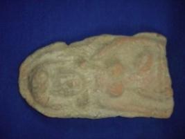 | Description / विवरण | Terracotta figurine of a female in low relief. The head had eyes and nose and incised face with an elaborate hair style. The figurine is bedecked with earrings and pearl girdle. The right hand has bangles and left is resting on waist. The breasts are prominent. Portion below hip is missing. |