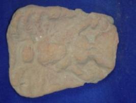 | Description / विवरण | Terracotta figurine of a female in relief. It is probably a Mother Goddess. The face is rubbed off and no features are identified. The figurine is bedecked with earrings, necklace and bangles. There is a hair lock on top of the head. There is decoration of pearl and feather strings around head. The hands are resting on waist. The portion below hip is missing. |