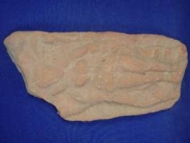 | Description / विवरण | Terracotta figurine of a female in relief. The figurine is rubbed off and features are not clear. It is bedecked with earrings, necklace and girdle. Both the hands are resting on waist. The feather design on upper left is visible. The upper part is mutilated. |