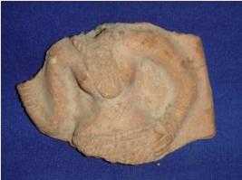 | Description / विवरण | Fragment of a terracotta female figure whose head and the body below waist is missing. The figurine is adorned with a heavily designed waist band, necklace and bangles. Her left hand is on her waist and right hand is raised upward but the palm is missing. |