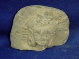 | Description / विवरण | Terracotta female figurine, only head is seen, having elaborate headgear with a floral design in the centre. She is bedecked with circular designed kundala. |