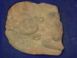 | Description / विवरण | Terracotta female figurine, probably of a Mother Goddess on a low relief. Only the upper part of the body from chest is visible. The figure has an elaborate head gear having floral designs in the centre and bedecked with kundala and necklace. Her hands are partly visible only arms and the whole figure is mutilated. |