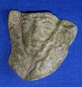 | Description / विवरण | Coarse terracotta tablet, with female head carved in low relief. Eyes, nose and lips are prominent. Eyebrows are clearly visible but hairs are chopped off. |
