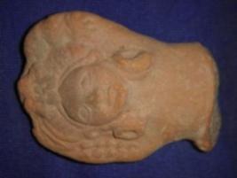 | Description / विवरण | Terracotta female head whose eyes, ears, nose and lips are prominent. She is wearing round earrings, with beautiful hair style and a pearl string is hanging from right side. |