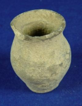 | Description / विवरण | Plain, ill fired, coarse terracotta Miniature pot with averted rim which is partly broken, bulbous body and flat circular base. |