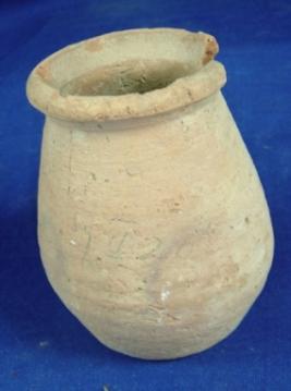 | Description / विवरण | Coarse, ill fired, terracotta Miniature pot with flat and round base, striation marks on the waist, the body is bulbous and mouth is wide and rim is averted. |