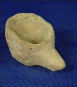 | Description / विवरण | Handmade, coarse tiny terracotta container with circular base, bulbous body open mouth and featureless rim which is partially broken. A hole is seen inside the spout probably used to pour water or oil. |
