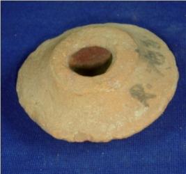 | Description / विवरण | Coarse terracotta circular lid with a flayed body. There is hole in one side where most probably fixed the knob and on the other side there is circular flat base. |