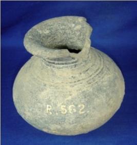 | Description / विवरण | Semi fine terracotta lota with averted out turn rim, narrow high neck, bulbous body, and circular flat base. Close striation marks are seen below the neck. A part of rim is broken. |