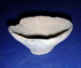 | Description / विवरण | Terracotta tiny bowl having flayered body, footed base with striation marks, featureless rim, coarse surface, deep depression at the middle of the bowl. |