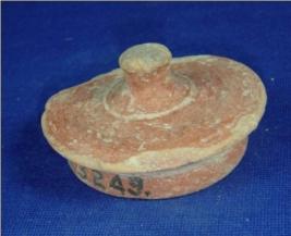 | Description / विवरण | Fine terracotta lid of pre-fired Gupta red pottery. The lid has circular hollow base, circular rim body with cylindrical round knob. Close striation marks are on the surface. The exterior part is of red colour and interior part has buff colour. Edges of the lid are broken. Earthly incrustation on it. |