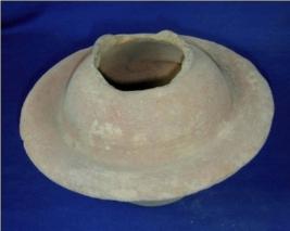 | Description / विवरण | Semi fired terracotta lid with flat and circular base. Its body has two parts, the lower part is betel nut shape, which the upper part in bulbous with a broken mouth. The body is highly carinated. |