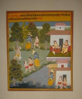 | Description / विवरण | Miniature painting based on Bihari Satsai, depicting scenes from Krishna s life. Krishna is shown playing with Gopis. In one panel, two Gopis are shown sitting and talking of Krishna. Vegetation is seen on the background. |