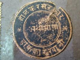 | Description / विवरण | A Holkar state stamp round in shape and black in colour, having half anna. Its value is wriiten in the centre. |