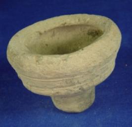 | Description / विवरण | Terracotta vessel - lid, ill fired broken from top carinated body with sparse striation marks and circular base, hollow inside |