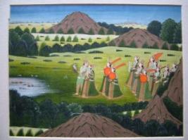 | Description / विवरण | The painting depicts Roopmati & Baj Bahadur holding each in standing posture. Baj Bahadur is holding falcon in one hand. Behind them, ten lady attendants are standing. In front of them, ducks are swimming in the river. In the foreground, there are trees, mountains and in the background, there are trees and mountains. |