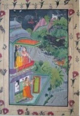 | Description / विवरण | The painting depicts Sawan Masa with a building in the foreground with a woman entering inside and on the upper floor, a man and woman are standing at the balcony. At another side, there is the depiction of wildlife with trees, elephants, tiger and a white dog. The forest is divided from the building by a river. There is a dark sky in the background. |