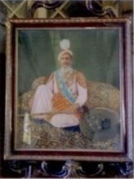 | Description / विवरण | Maharaja Jai Singh sitting on the highly decorated cushion with golden floral designs, a decorated shield over that and having a sword with a golden decorated cover. He is wearing a purple gown with golden decoration on shoulder and chest, with the light green band on, medals and precious stones jewellery. His turban of saffron colour is mounted by the white feather. |
