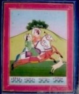 | Description / विवरण | The painting depicts Shahzada & Shahzadi , riding their horse in a green field. A deer is also running side by side with them. In the foreground, the lotus is flowing in the river. In the background, there is a mountain upon which trees are there & blue with orange colour faded sky. It has a border made up of yellow blue & red colour. |