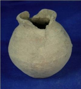 | Description / विवरण | Terracotta pot with flat, circular base, round body, low neck and thin and averted rim. some parts of neck and rim is broken. It is slightly cracked and has a smooth outer surface. |