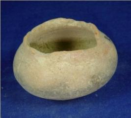 | Description / विवरण | Terracotta pot with flat and circular base, round body, low neck, wide mouth and thin rim which is partially rubbed off. It is slightly cracked. |
