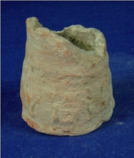 | Description / विवरण | Terracotta pot with circular and flat base and conical body, upper part of which is broken. Its outer and inner part is of red colour while core is black. It is a coarse pottery and ill fired. |