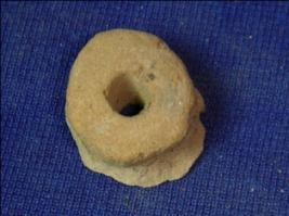 | Description / विवरण | Terracotta wheel with a hole in the centre and convex rim. One surface in smooth and flat. The other surface is rough with sharp rim edges. It was probably used in toy cart. The rim is broken. |